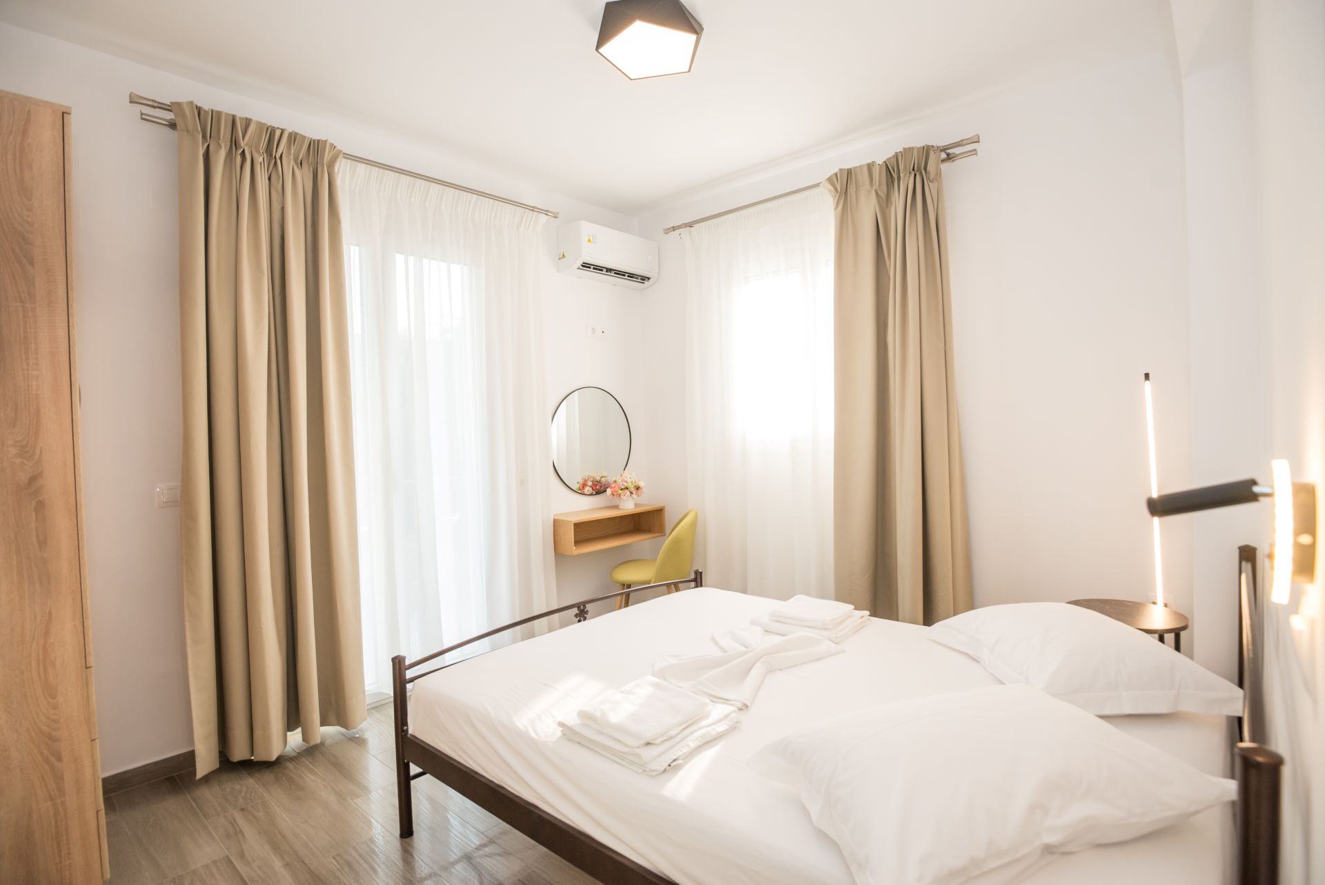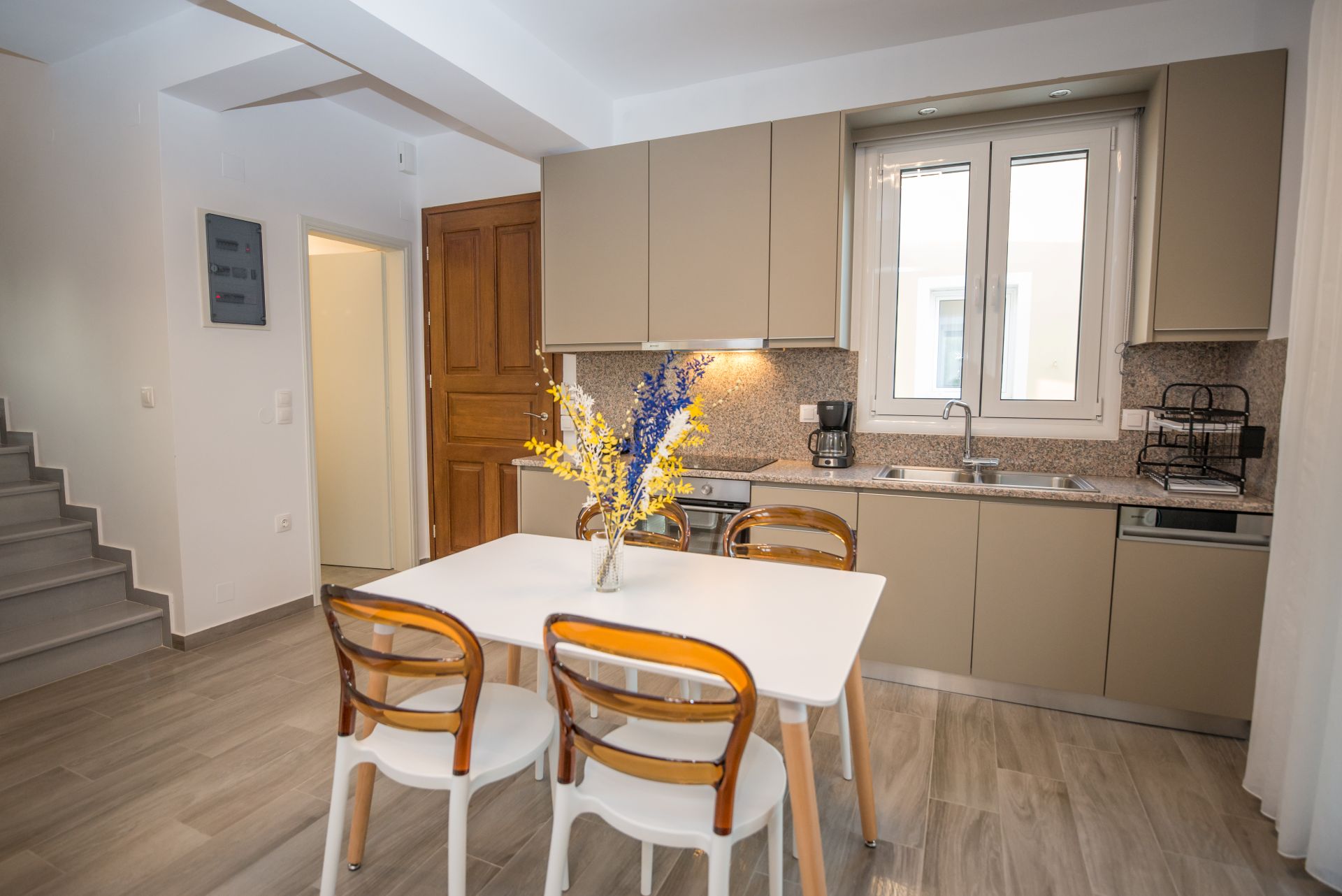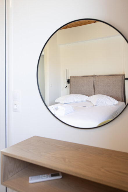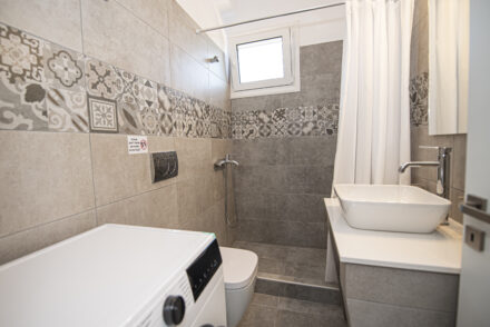 The accommodation is a two-storey apartment with a surface of 103 square meters, and can accommodate up to 6 people. The first level (elevated ground floor) has a fully equipped kitchen, a living room with TV, a bedroom with a double bed and a bathroom. The second level (first floor) has a bedroom with a double bed, a bedroom with two single beds and a bathroom.